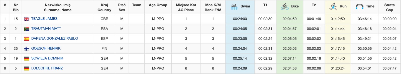It may have been nearly three years since we last saw him race, but it was no surprise to see Lukasz Wojt – a former swimmer born in Gdańsk, but living in Germany – take the lead in the swim. Wojt left no room for doubt, with an impressive swim time of 22:21 minutes over 40 seconds ahead of his closest competitors: Dapena Gonzalez and Poland’s Brembor Tomasz. Six athletes where on the heels of the lead group. These chasers included James Teagle (GBR), Franz Loeschke (GER), Matt Trautman (RSA), Henrik Goesch (FIN) and Evert Scheltinga (NED), coming out of the swim 1:39 down on Wojt.