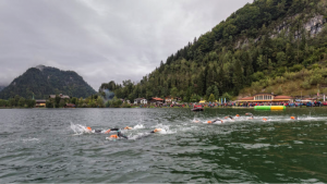 A straight forward one lap course in the gorgeous mild waters of Lake Walchsee. It’s clearly marked with easily sited buoys as wells various land marks that you can also use. When you make the last turn, you just head to the yellow tower of the church that raises up from the trees, marking transition and the race finish line, as well of course the swim exit.